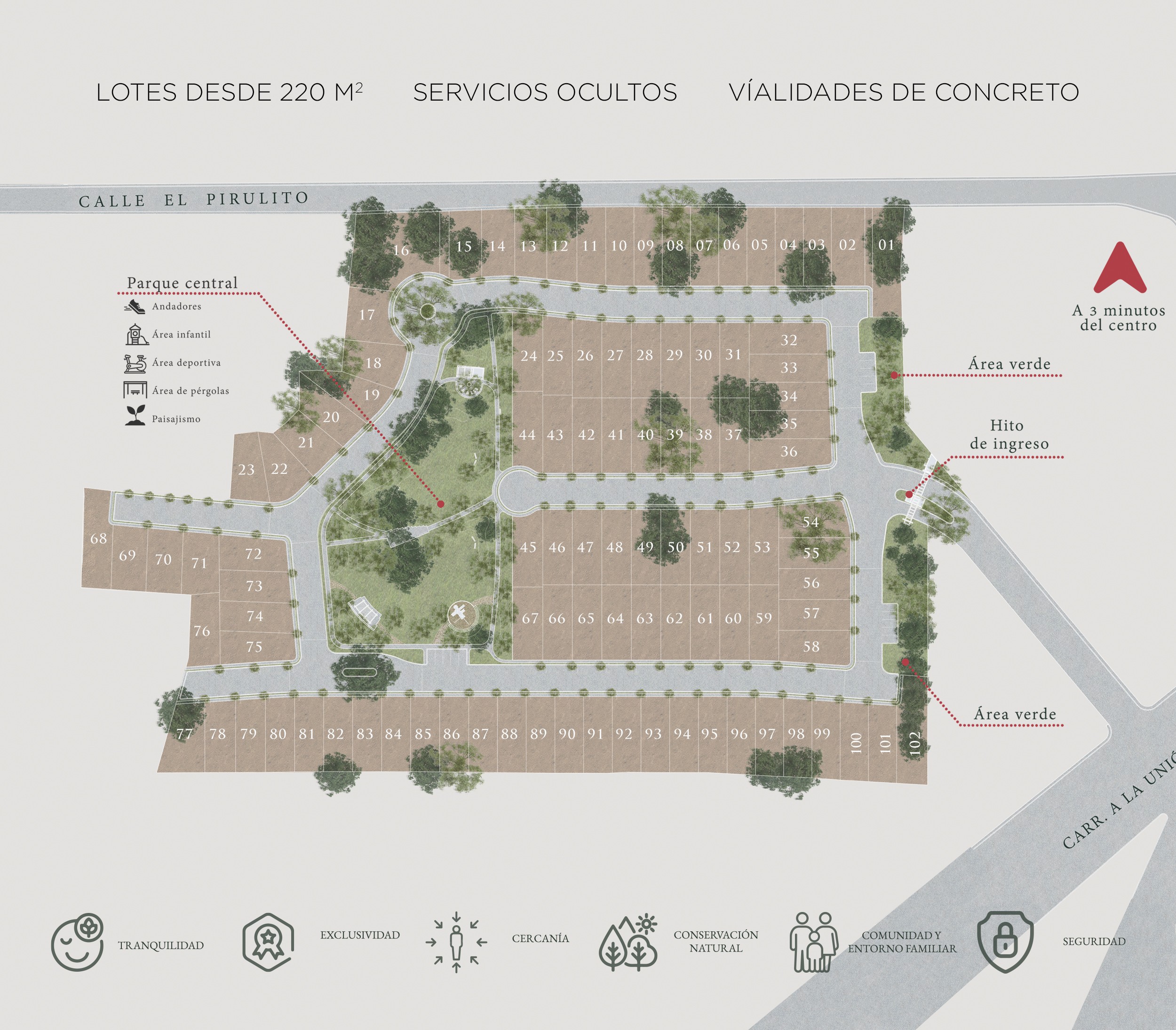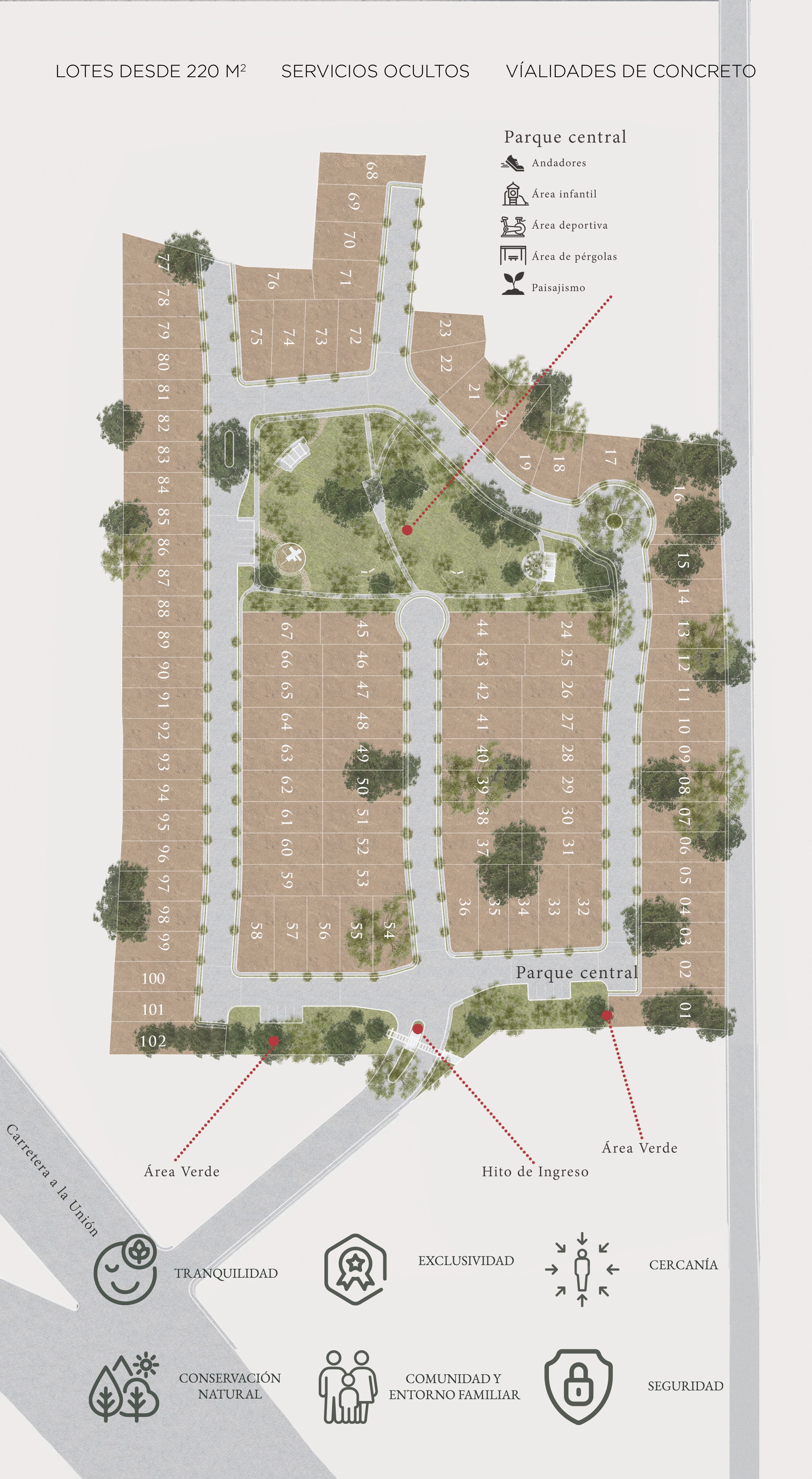 Es un desarrollo residencial que se compone de un total de 102 lotes, con superficies desde los 220 m² como un espacio ideal para quienes buscan confort y calidad de vida.
